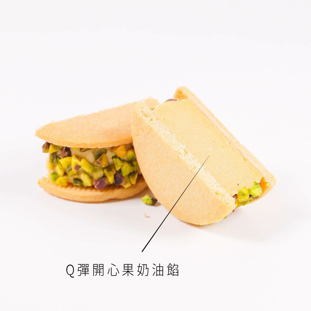 有別於常態版的夾心餅乾,開心果版本的內餡比例更高,並且裹上一整圈的開心果碎粒,光是用看的就開心。