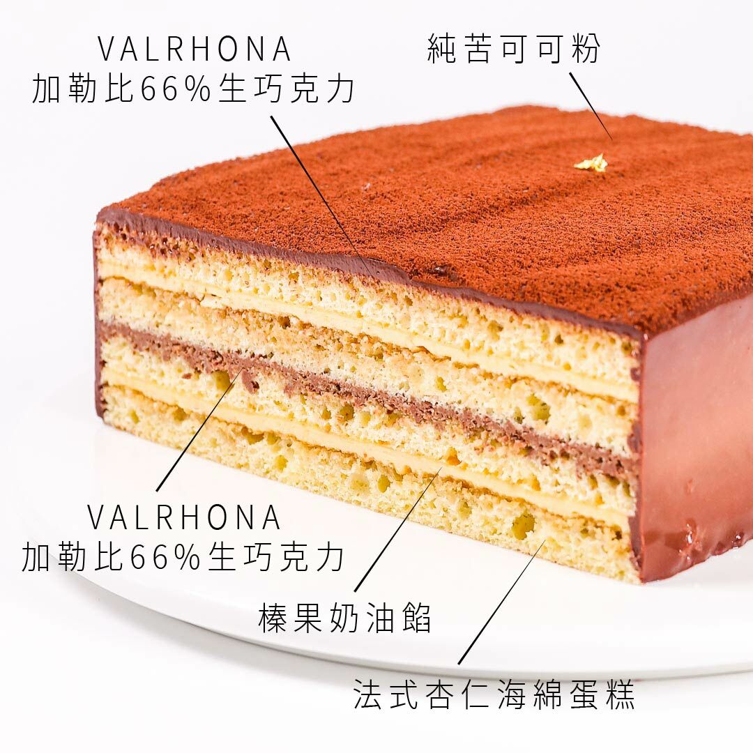 此款榛果巧克力蛋糕其實就是歌劇院蛋糕的進化版喔!傳統的歌劇院蛋糕是沒有加入榛果醬的,但主廚私心覺得加入榛果醬後,不但香氣更有層次,味道也更有變化!