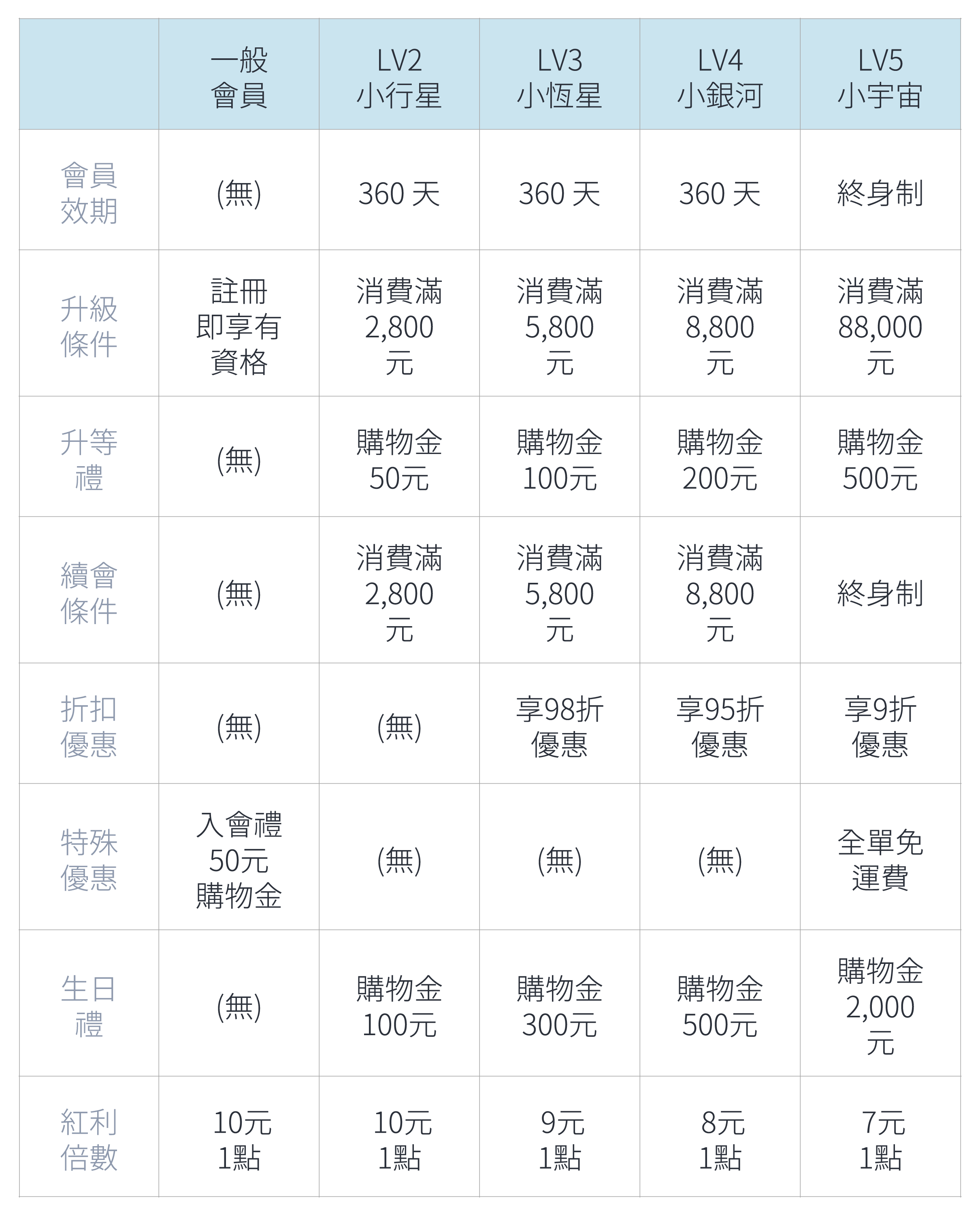 .入會禮、生日禮,按會員等級享有額外消費折扣與新品上市優惠
