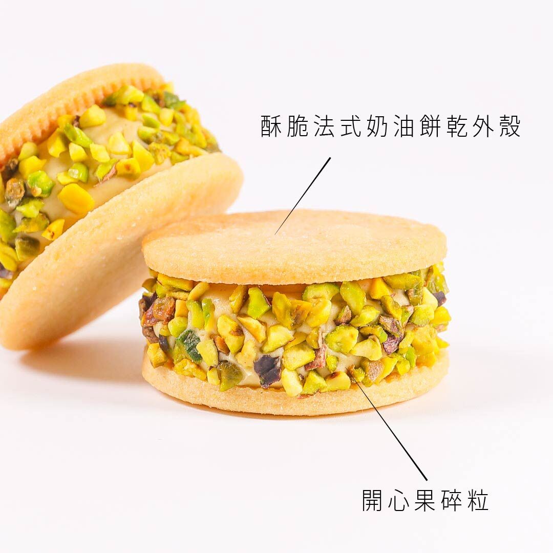 有別於常態版的夾心餅乾,開心果版本的內餡比例更高,並且裹上一整圈的開心果碎粒,光是用看的就開心。