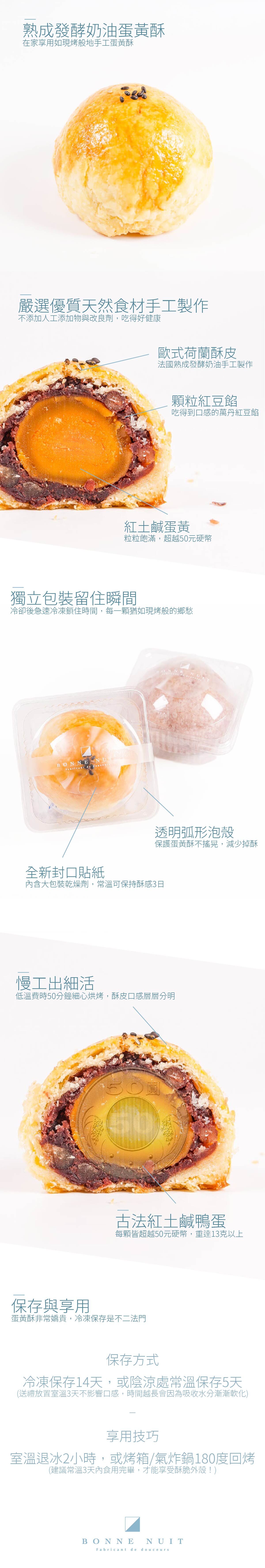 蛋黃酥非常脆弱,如果想吃到如同現烤般的滋味,外酥內軟香氣四溢,建議在冷凍保存,可以放置14天。冷氣房或陰涼處也可保存5天,不過酥酥的外皮會因為吸收紅豆和鹹蛋的水分軟化喔!其他甜點皆可在常溫保存5-14天,詳情請見包裝背面所示。